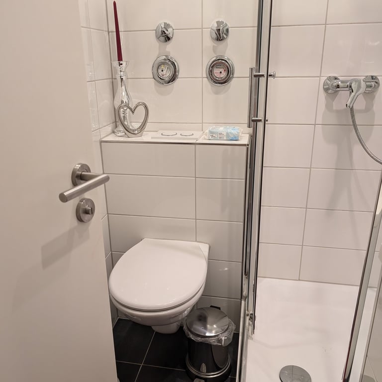 Dieses Apartment verfügt über einen persönlichen Parkplatz im Innenhof und einen hübschen kleinen Balkon und ist in einer rot-weiß-floralen Optik gehalten.